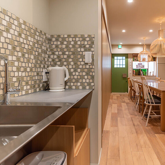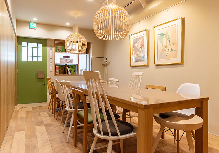 12人が大きなテーブルを囲んでゆったり座れるパーティールームをご自由にお使いいただけます。女子会や誕生会、家族会、セミナー合宿などにもご利用いただいております。高速大容量ビジネスWi-Fiでリモートワーク、ライブ配信も可能。