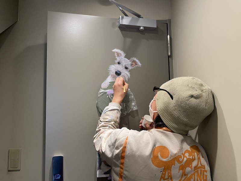 久しぶりにお会いして愛犬(ホワイトシュナウザー)をドアに描いてもらうことに。